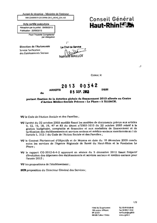portant fixation de la dotation globale de financement 2013 allouée au centre d'action médico-sociale précoce "Le Phare" à ILLZACH. Resumé Pièces jointes ARRETE Assemblée : Non défini Date : 05/09/2013 Rapporteur : Non défini Collectivité : Conseil départemental du Haut-Rhin Direction : Non défini Service : Direction de l'Autonomie Domaine : Dotations financières Commission :
