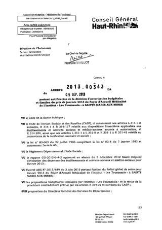 portant notification de la décision d'autorisation budgétaire et fixation du prix de journée 2013 du foyer d'accueil médicalisé de l'Institut "Les Tournesols" à SAINTE MARIE AUX MINES. Resumé Pièces jointes ARRETE Assemblée : Non défini Date : 05/09/2013 Rapporteur : Non défini Collectivité : Conseil départemental du Haut-Rhin Direction : Non défini Service : Direction de l'Autonomie Domaine : Prix de Journée Commission :