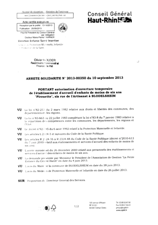 portant autorisation d'ouverture temporaire de l'établissement d'accueil d'enfants de moins de six ans "Pirouette", sis rue de l'Artisanat à BLODELSHEIM. Resumé Pièces jointes ARRETE Assemblée : Non défini Date : 10/09/2013 Rapporteur : Non défini Collectivité : Conseil départemental du Haut-Rhin Direction : Non défini Service : Direction Enfance Santé Insertion Domaine : Accueil d'enfants Commission :