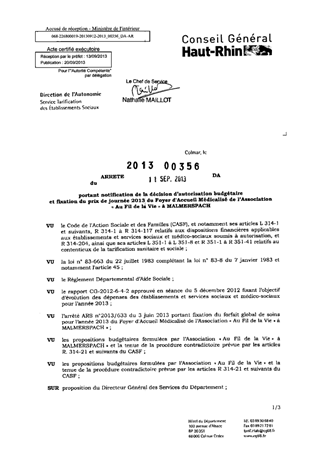 portant notification de la décision d'autorisation budgétaire et fixation du prix de journée 2013 du foyeer d'accueil médicalisé de l'association "Au Fil de la Vie" à MALMERSPACH. Resumé Pièces jointes ARRETE Assemblée : Non défini Date : 11/09/2013 Rapporteur : Non défini Collectivité : Conseil départemental du Haut-Rhin Direction : Non défini Service : Direction de l'Autonomie Domaine : Prix de Journée Commission :