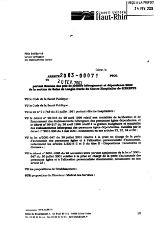 portant fixation des prix de journée hébergement et dépendance 2003 de la section de soins de longue durée du centre hospitalier de SIERENTZ. Resumé Pièces jointes ARRETE Assemblée : Non défini Date : 20/02/2003 Rapporteur : Non défini Collectivité : Conseil départemental du Haut-Rhin Direction : Non défini Service : Direction de la Solidarité Domaine : Prix de Journée Commission :