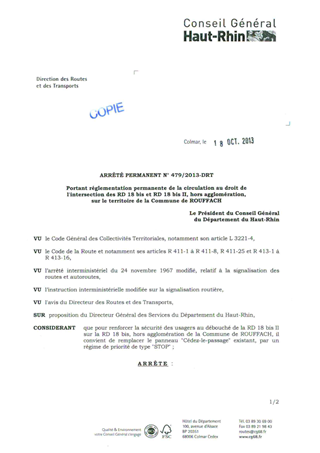 portant réglementation permanente de la circulation au droit de l'intersection des RD 18 bis et RD 18 bis II, hors agglomération, sur le territoire de la commune de ROUFFACH. Resumé Pièces jointes ARRETE Assemblée : Non défini Date : 18/10/2013 Rapporteur : Non défini Collectivité : Conseil départemental du Haut-Rhin Direction : Non défini Service : Direction des Routes Domaine : Circulation Commission :