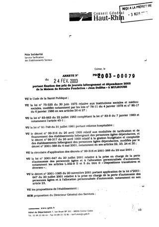 portant fixation des prix de journée hébergement et dépendance 2003 de la maison de retraite fondation "Jean Dollfus" à MULHOUSE. Resumé Pièces jointes ARRETE Assemblée : Non défini Date : 24/02/2003 Rapporteur : Non défini Collectivité : Conseil départemental du Haut-Rhin Direction : Non défini Service : Direction de la Solidarité Domaine : Prix de Journée Commission :