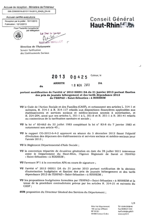 portant modification de l'arrêté n° 2013-00051-DA du 31.01.2013 portant fixation des prix de journée hébergement et des tarifs dépendance 2013 de l'EHPAD "Saint-Sébastien" à RIXHEIM. Resumé Pièces jointes ARRETE Assemblée : Non défini Date : 18/11/2013 Rapporteur : Non défini Collectivité : Conseil départemental du Haut-Rhin Direction : Non défini Service : Direction de l'Autonomie Domaine : Prix de Journée Commission :