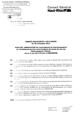 portant abrogation de l'autorisation de fonctionnement de l'établissement d'accueil d'enfants de moins de six ans "Halte-garderie L'Envol", sis au 2 rue du 6 Février à ENSISHEIM. Resumé Pièces jointes ARRETE Assemblée : Non défini Date : 20/11/2013 Rapporteur : Non défini Collectivité : Conseil départemental du Haut-Rhin Direction : Non défini Service : Direction Enfance Santé Insertion Domaine : Accueil d'enfants Commission :