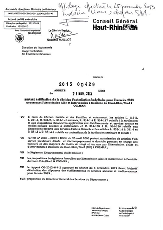 portant notification de la décision d'autorisation budgétaire pour l'exercice 2013 concernant l'Association Aide et Intervention à Domicile du Haut-Rhin/Nord à COLMAR. Resumé Pièces jointes ARRETE Assemblée : Non défini Date : 21/11/2013 Rapporteur : Non défini Collectivité : Conseil départemental du Haut-Rhin Direction : Non défini Service : Direction de l'Autonomie Domaine : Dotations financières Commission :