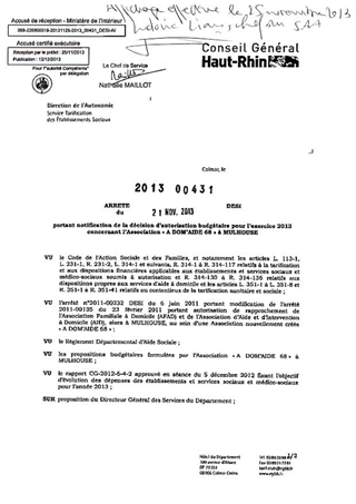 portant notification de la décision d'autorisation budgétaire de l'exercice 2013 concernant l'Association "A Dom'Aide 68" à MULHOUSE. Resumé Pièces jointes ARRETE Assemblée : Non défini Date : 21/11/2013 Rapporteur : Non défini Collectivité : Conseil départemental du Haut-Rhin Direction : Non défini Service : Direction de l'Autonomie Domaine : Dotations financières Commission :
