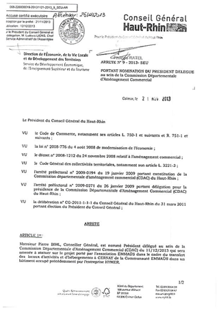 portant nomination du Président délégué au sein de la Commission Départementale d'Aménagement Commercial. Resumé Pièces jointes ARRETE Assemblée : Non défini Date : 21/11/2013 Rapporteur : Non défini Collectivité : Conseil départemental du Haut-Rhin Direction : Non défini Service : Service Développement Economique Domaine : Autres (non classés) Commission :