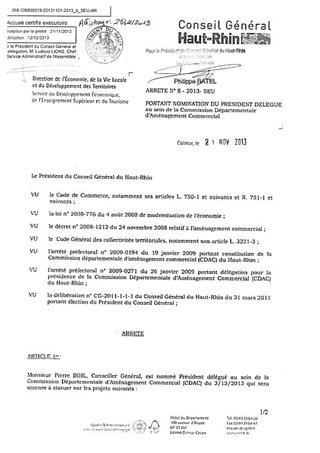 portant nomination du Président délégué au sein de la Commission Départementale d'Aménagement Commercial. Resumé Pièces jointes ARRETE Assemblée : Non défini Date : 21/11/2013 Rapporteur : Non défini Collectivité : Conseil départemental du Haut-Rhin Direction : Non défini Service : Service Développement Economique Domaine : Autres (non classés) Commission :