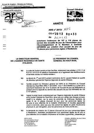 autorisant l'extension de 107 à 119 places du service des accueils de jour de l'association pour l'accompagnement et le maintien à domicile (APAMAD) par création d'un accueil de jour de 12 places pour personnes âgées à RIEDISHEIM. Resumé Pièces jointes ARRETE Assemblée : Non défini Date : 26/11/2013 Rapporteur : Non défini Collectivité : Conseil départemental du Haut-Rhin Direction : Non défini Service : Direction de l'Autonomie Domaine : Personnes Agées Commission :