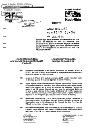 portant rejet de la demande d'extension de 12 à 24 places de l'accueil de jour "Le Pfarrhüs" par création de 12 places d'accueil de jour à RIXHEIM pour personnes âgées, présentée par l'association pour le développement de l'accueil de jour "Le Pfarrhüs"