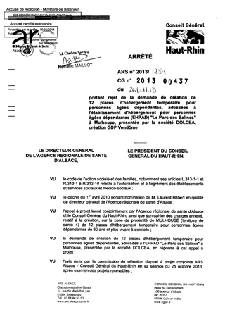 portant rejet de la demande de création de 12 places d'hébergement temporaire pour personnes âgées dépendantes, adossées à l'établissement d'hébergement pour personnes âgées dépendantes (EHPAD) "Le Parc des Salines" à MULHOUSE, présentée par la Sté DOLCEA
