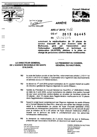 autorisant la médicalisation de 10 places du service d'accueil de jour Evasion (site de Mulhouse), géré par l'association pou l'information scientifique et technique en rééducation (Alister), dédiées à la prise en charge de personnes cérébro-lésées vieill