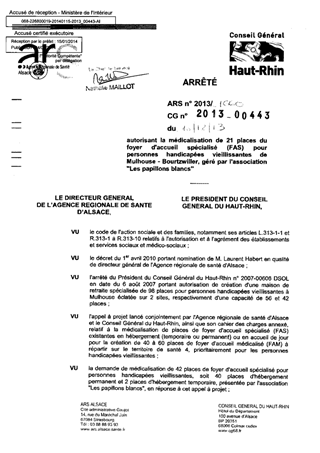 autorisant la médicalisation de 21 places du foyer d'accueil spécialisé (FAS) pour personnes handicapées vieillissantes de Mulhouse - Bourtzwiller, géré par l'association "Les Papillons Blancs". Resumé Pièces jointes ARRETE Assemblée : Non défini Date : 18/12/2013 Rapporteur : Non défini Collectivité : Conseil départemental du Haut-Rhin Direction : Non défini Service : Direction de l'Autonomie Domaine : Personnes Agées Commission :