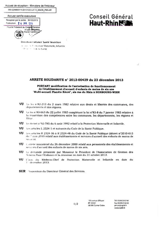 portant modification de l'autorisation de fonctionnement de l'établissement d'accueil d'enfants de moins de six ans "Multi-accueil Planète Récré", sis rue du Rhin à HORBOURG WIHR Resumé Pièces jointes ARRETE Assemblée : Non défini Date : 23/12/2013 Rapporteur : Non défini Collectivité : Conseil départemental du Haut-Rhin Direction : Non défini Service : Direction Enfance Santé Insertion Domaine : Accueil d'enfants Commission :
