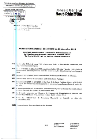 portant modification de l'autorisation de fonctionnement de l'établissement d'accueil d'enfants de moins de six ans "La Courte Echelle", sis rue du Rhin à HORBOURG WIHR. Resumé Pièces jointes ARRETE Assemblée : Non défini Date : 23/12/2013 Rapporteur : Non défini Collectivité : Conseil départemental du Haut-Rhin Direction : Non défini Service : Direction Enfance Santé Insertion Domaine : Accueil d'enfants Commission :