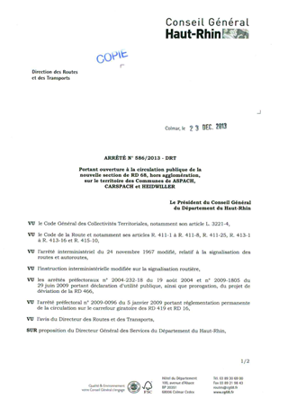 portant ouverture à la circulation publique de la nouvelle section de RD 68, hors agglomération, sur le territoire des communes de ASPACH, CARSPACH et HEIDWILLER. Resumé Pièces jointes ARRETE Assemblée : Non défini Date : 23/12/2013 Rapporteur : Non défini Collectivité : Conseil départemental du Haut-Rhin Direction : Non défini Service : Direction des Routes Domaine : Circulation Commission :