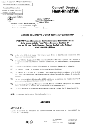 portant modification de l'autorisation de fonctionnement de la micro-crèche "Les P'tites Pousses Section 1", sise au 32 rue Paul Cézanne, Centre d'Affaires Le Trident à MULHOUSE (68200). Resumé Pièces jointes ARRETE Assemblée : Non défini Date : 07/01/2014 Rapporteur : Non défini Collectivité : Conseil départemental du Haut-Rhin Direction : Non défini Service : Direction Enfance Santé Insertion Domaine : Accueil d'enfants Commission :