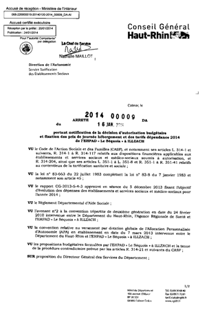 portant notification de la décision d'autorisation budgétaire et fixation des prix de journée hébergement et des tarifs dépendance 2014 de l'EHPAD "Les Séquoïa" à ILLZACH.. Resumé Pièces jointes ARRETE Assemblée : Non défini Date : 16/01/2014 Rapporteur : Non défini Collectivité : Conseil départemental du Haut-Rhin Direction : Non défini Service : Direction de l'Autonomie Domaine : Prix de Journée Commission :