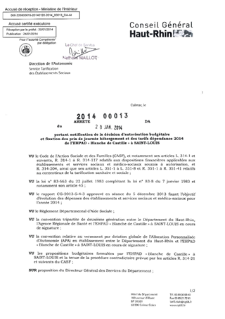 portant notification de la décision d'autorisation budgétaire et fixation des prix de journée hébergement et des tarifs dépendance 2014 de l'EHPAD "Blanche de Castille" à SAINT-LOUIS. Resumé Pièces jointes ARRETE Assemblée : Non défini Date : 20/01/2014 Rapporteur : Non défini Collectivité : Conseil départemental du Haut-Rhin Direction : Non défini Service : Direction de l'Autonomie Domaine : Prix de Journée Commission :