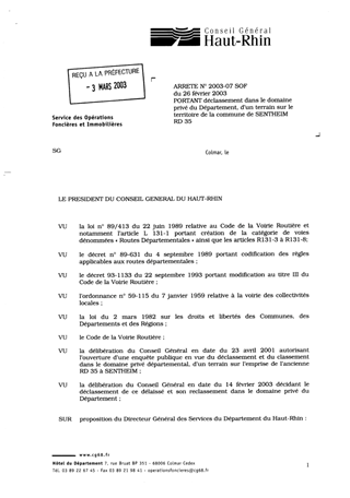 portant déclassement dans le domaine privé du Département, d'un terrain sur le territoire de la commune de SENTHEIM - RD 35. Resumé Pièces jointes ARRETE Assemblée : Non défini Date : 26/02/2003 Rapporteur : Non défini Collectivité : Conseil départemental du Haut-Rhin Direction : Non défini Service : Service du Patrimoine et du droit des Sols Domaine : Déclassement de voirie Commission :