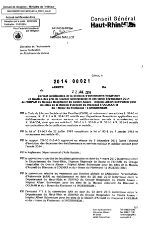 portant notification de la décision d'autorisation budgétaire et fixation des prix de journée hébergement et des tarifs dépendance 2014 de l'EHPAD du groupe hospitalier du Centre Alsace - Hôpital Albert Schweitzer pour les sites de la Maison d'Accueil du