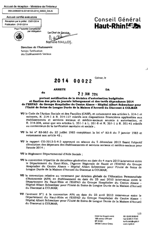 portant notification de la décision d'autorisation budgétaire et fixation des prix de journée hébergement et des tarifs dépendance 2014 de l'EHPAD du Groupe Hospitalier du Centre Alsace - Hôpital Albert Schweitzer pour l'unité de soins de longue durée de