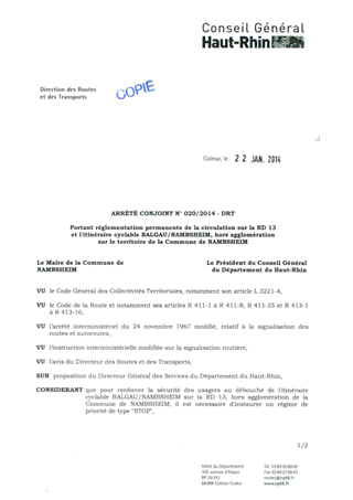 portant réglementation permanente de la circulation sur la RD 13 et l'itinéraire cyclable BALGAU/NAMBSHEIM, hors agglomération, sur le territoire de la commune de NAMBSHEIM. Resumé Pièces jointes ARRETE Assemblée : Non défini Date : 22/01/2014 Rapporteur : Non défini Collectivité : Conseil départemental du Haut-Rhin Direction : Non défini Service : Direction des Routes Domaine : Circulation Commission :