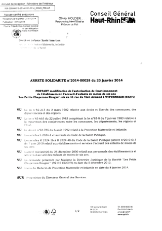 portant modification de l'autorisation de fonctionnement de l'établissement d'accueil d'enfants de moins de six ans "Les Petits Chaperons Rouges", sis au 41 rue du Vieil Armand à WITTENHEIM (68270). Resumé Pièces jointes ARRETE Assemblée : Non défini Date : 23/01/2014 Rapporteur : Non défini Collectivité : Conseil départemental du Haut-Rhin Direction : Non défini Service : Direction Enfance Santé Insertion Domaine : Accueil d'enfants Commission :