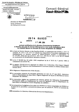 portant notification de la décision d'autorisation budgétaire et fixation des prix de journée hébergement et des tarifs dépendance 2014 de l'EHPAD Maison de Retraite du centre hospitalier de CERNAY. Resumé Pièces jointes ARRETE Assemblée : Non défini Date : 27/01/2014 Rapporteur : Non défini Collectivité : Conseil départemental du Haut-Rhin Direction : Non défini Service : Direction de l'Autonomie Domaine : Prix de Journée Commission :