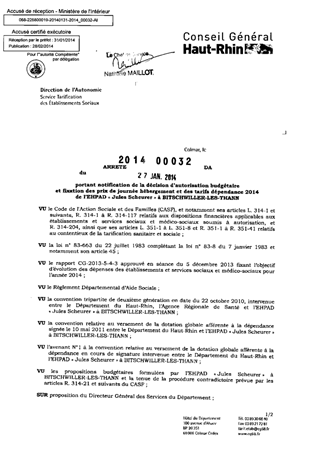 portant notification de la décision d'autorisation budgétaire et fixation des prix de journée hébergement et des tarifs dépendance 2014 de l'EHPAD "Jules Scheurer" à BITSCHWILLER LES THANN. Resumé Pièces jointes ARRETE Assemblée : Non défini Date : 27/01/2014 Rapporteur : Non défini Collectivité : Conseil départemental du Haut-Rhin Direction : Non défini Service : Direction de l'Autonomie Domaine : Prix de Journée Commission :