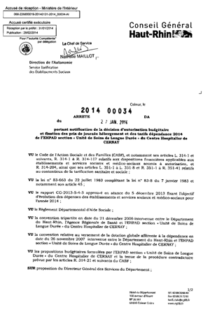 portant notification de la décision d'autorisation budgétaire et fixation des prix de journée hébergement et des tarifs dépendance 2014 de l'EHPAD section "Unité de soins de longue durée" du centre hospitalier de CERNAY. Resumé Pièces jointes ARRETE Assemblée : Non défini Date : 27/01/2014 Rapporteur : Non défini Collectivité : Conseil départemental du Haut-Rhin Direction : Non défini Service : Direction de l'Autonomie Domaine : Prix de Journée Commission :