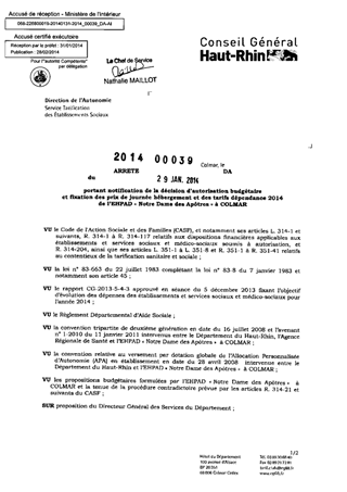 portant notification de la décision d'autorisation budgétaire et fixation des prix de journée hébergement et des tarifs dépendance 2014 de l'EHPAD "Notre Dame des Apôtres" à COLMAR. Resumé Pièces jointes ARRETE Assemblée : Non défini Date : 29/01/2014 Rapporteur : Non défini Collectivité : Conseil départemental du Haut-Rhin Direction : Non défini Service : Direction de l'Autonomie Domaine : Prix de Journée Commission :