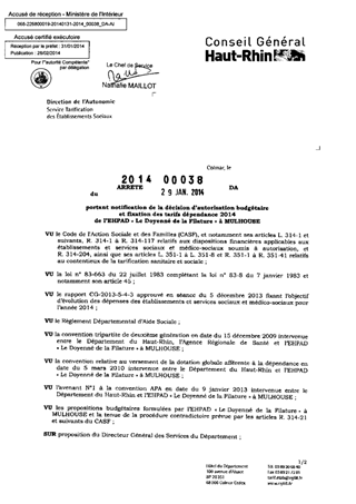 portant notification de la décision d'autorisation budgétaire et fixation des tarifs dépendance 2014 de l'EHPAD "Le Doyenné de la Filature" à MULHOUSE. Resumé Pièces jointes ARRETE Assemblée : Non défini Date : 29/01/2014 Rapporteur : Non défini Collectivité : Conseil départemental du Haut-Rhin Direction : Non défini Service : Direction de l'Autonomie Domaine : Prix de Journée Commission :