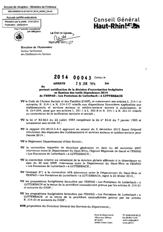 portant notification de la décision d'autorisation budgétaire et fixation des tarifs dépendance 2014 de l'EHPAD "Les Fontaines de Lutterbach" à LUTTERBACH. Resumé Pièces jointes ARRETE Assemblée : Non défini Date : 29/01/2014 Rapporteur : Non défini Collectivité : Conseil départemental du Haut-Rhin Direction : Non défini Service : Direction de l'Autonomie Domaine : Prix de Journée Commission :