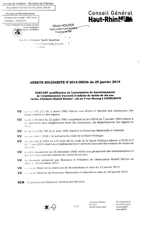 portant modification de l'autorisation de fonctionnement de l'établissement d'accueil d'enfants de moins de six ans "Jardin d'Enfants Rudolf Steiner", sis au 4 rue Herzog à LOGELBACH. Resumé Pièces jointes ARRETE Assemblée : Non défini Date : 29/01/2014 Rapporteur : Non défini Collectivité : Conseil départemental du Haut-Rhin Direction : Non défini Service : Direction Enfance Santé Insertion Domaine : Accueil d'enfants Commission :
