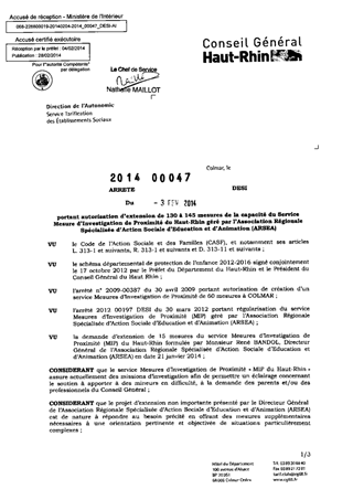 portant autorisation d'extension de 130 à 145 mesures de la capacité du service mesure d'investigation de proximité du Haut-Rhin géré par l'Association Régionale Spécialisée d'Action Sociale d'Education et d'Animation (ARSEA) Resumé Pièces jointes ARRETE Assemblée : Non défini Date : 03/02/2014 Rapporteur : Non défini Collectivité : Conseil départemental du Haut-Rhin Direction : Non défini Service : Direction de l'Autonomie Domaine : Autres (non classés) Commission :