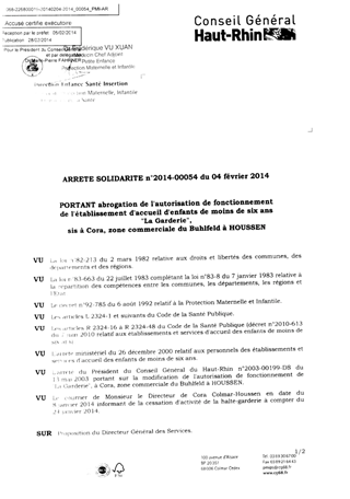 portant abrogation de l'autorisation de fonctionnement de l'établissement d'accueil d'enfants de moins de six ans "La Garderie", sis à Cora, zone commerciale du Buhlfeld à HOUSSEN. Resumé Pièces jointes ARRETE Assemblée : Non défini Date : 04/02/2014 Rapporteur : Non défini Collectivité : Conseil départemental du Haut-Rhin Direction : Non défini Service : Direction Enfance Santé Insertion Domaine : Accueil d'enfants Commission :