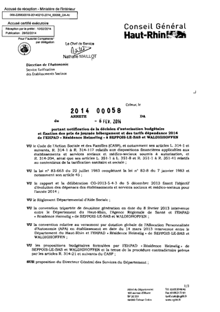portant notification de la décision d'autorisation budgétaire et fixation des prix de journée hébergement et des tarifs dépendance 2014 de l'EHPAD "Résidence Heimeling" à SEPPOIS LE BAS et WALDIGHOFFEN. Resumé Pièces jointes ARRETE Assemblée : Non défini Date : 06/02/2014 Rapporteur : Non défini Collectivité : Conseil départemental du Haut-Rhin Direction : Non défini Service : Direction de l'Autonomie Domaine : Prix de Journée Commission :