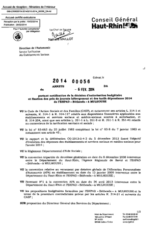 portant notification de la décision d'autorisation budgétaire et fixation des prix de journée hébergement et des tarifs dépendance 2014 de l'EHPAD "Béthesda" à MULHOUSE. Resumé Pièces jointes ARRETE Assemblée : Non défini Date : 06/02/2014 Rapporteur : Non défini Collectivité : Conseil départemental du Haut-Rhin Direction : Non défini Service : Direction de l'Autonomie Domaine : Prix de Journée Commission :