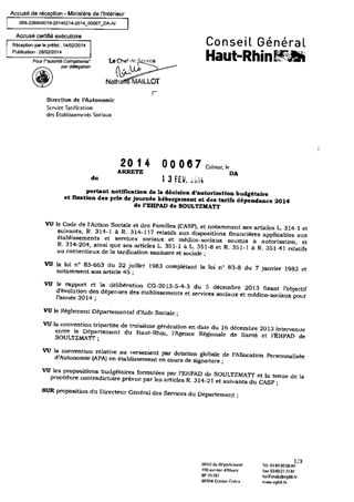 portant notification de la décision d'autorisation budgétaire et fixation des prix de journée hébergement et des tarifs dépendance 2014 de l'EHPAD de SOULTZMATT. Resumé Pièces jointes ARRETE Assemblée : Non défini Date : 13/02/2014 Rapporteur : Non défini Collectivité : Conseil départemental du Haut-Rhin Direction : Non défini Service : Direction de l'Autonomie Domaine : Prix de Journée Commission :