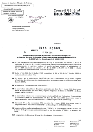 portant notification de la décision d'autorisation budgétaire et fixation des prix de journée hébergement et des tarifs dépendance 2014 de l'EHPAD "Le Beau Regard" à MULHOUSE. Resumé Pièces jointes ARRETE Assemblée : Non défini Date : 17/02/2014 Rapporteur : Non défini Collectivité : Conseil départemental du Haut-Rhin Direction : Non défini Service : Direction de l'Autonomie Domaine : Prix de Journée Commission :