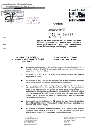rejetant la médicalisation de 12 places de foyer d'accueil spécialisé de l'Institut Saint Joseph à BELLEMAGNY-LUTTERBACH, géré par l'association "Institut Saint Joseph BELLEMAGNY-LUTTERBACH". Resumé Pièces jointes ARRETE Assemblée : Non défini Date : 19/02/2014 Rapporteur : Non défini Collectivité : Conseil départemental du Haut-Rhin Direction : Non défini Service : Direction de l'Autonomie Domaine : Autres (non classés) Commission :