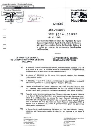 autorisant la médicalisation de 12 places du foyer d'accueil spécialisé (FAS) Saint André de Cernay, géré par l'association Adèle de Glaubitz, dédiées à la prise en charge de personnes handicapées vieillissantes. Resumé Pièces jointes ARRETE Assemblée : Non défini Date : 19/02/2014 Rapporteur : Non défini Collectivité : Conseil départemental du Haut-Rhin Direction : Non défini Service : Direction de l'Autonomie Domaine : Autres (non classés) Commission :