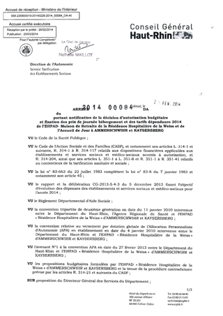 portant notification de la décision d'autorisation budgétaire et fixation des prix de journée hébergement et des tarifs dépendance 2014 de l'EHPAD - Maison de retraite de la Résidence hospitalière de la Weiss et de l'accueil de jour à AMMERSCHWIHR et KAYS