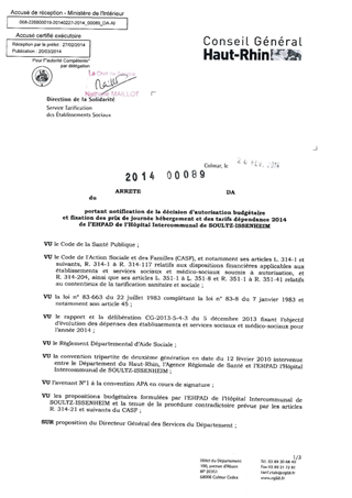 portant notification de la décision d'autorisation budgétaire et fixation des prix de journée hébergement et des tarifs dépendance 2014 de l'EHPAD de l'hôpital intercommunal de SOULTZ-ISSENHEIM. Resumé Pièces jointes ARRETE Assemblée : Non défini Date : 26/02/2014 Rapporteur : Non défini Collectivité : Conseil départemental du Haut-Rhin Direction : Non défini Service : Direction de l'Autonomie Domaine : Prix de Journée Commission :