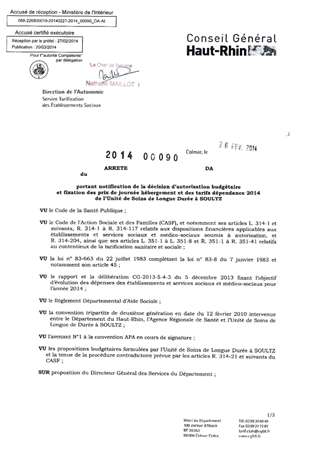 portant notification de la décision d'autorisation budgétaire et fixation des prix de journée hébergement et des tarifs dépendance 2014 de l'unité de soins de longue durée à SOULTZ. Resumé Pièces jointes ARRETE Assemblée : Non défini Date : 26/02/2014 Rapporteur : Non défini Collectivité : Conseil départemental du Haut-Rhin Direction : Non défini Service : Direction de l'Autonomie Domaine : Prix de Journée Commission :