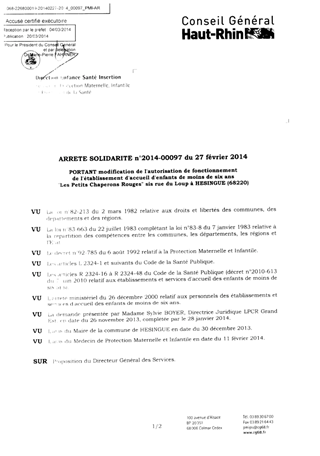 portant modification de l'autorisation de fonctionnement de l'établissement d'accueil d'enfants de moins de six ans "Les Petits Chaperons Rouges" sis rue du Loup à HESINGUE (68220). Resumé Pièces jointes ARRETE Assemblée : Non défini Date : 27/02/2014 Rapporteur : Non défini Collectivité : Conseil départemental du Haut-Rhin Direction : Non défini Service : Direction Enfance Santé Insertion Domaine : Accueil d'enfants Commission :