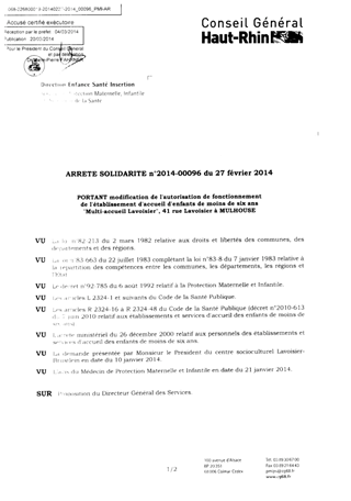portant modification de l'autorisation de fonctionnement de l'établissement d'accueil d'enfants de moins de six ans "Multi-accueil Lavoirsier", 41 rue Lavoisier à MULHOUSE. Resumé Pièces jointes ARRETE Assemblée : Non défini Date : 27/02/2014 Rapporteur : Non défini Collectivité : Conseil départemental du Haut-Rhin Direction : Non défini Service : Direction Enfance Santé Insertion Domaine : Accueil d'enfants Commission :