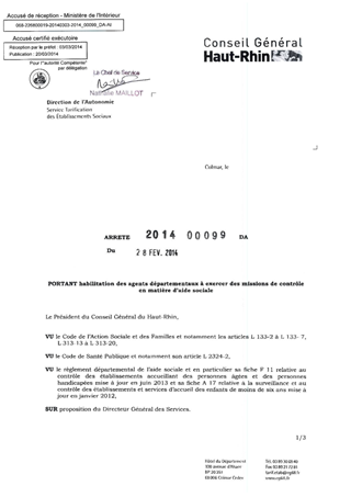 portant habilitation des agents départementaux à exercer des missions de contrôle en matière d'aide sociale. Resumé Pièces jointes ARRETE Assemblée : Non défini Date : 28/02/2014 Rapporteur : Non défini Collectivité : Conseil départemental du Haut-Rhin Direction : Non défini Service : Direction de l'Autonomie Domaine : Autres (non classés) Commission :